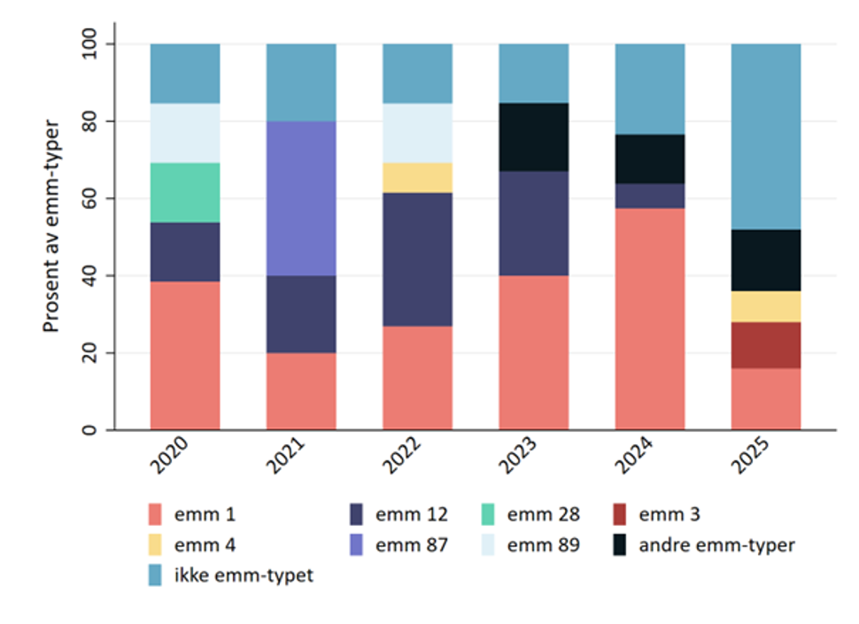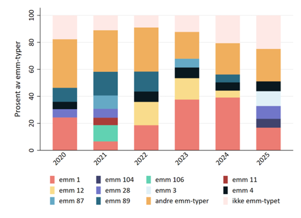 Figur 3: Andel av ulike emm-typer blant invasive gruppe A streptokokker i Norge 2020 – juni 2025.