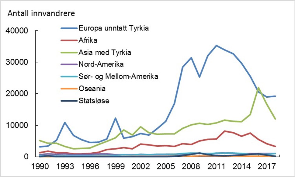Figur 1. Innvandring til Norge etter fraflyttingsområde 1990-2018