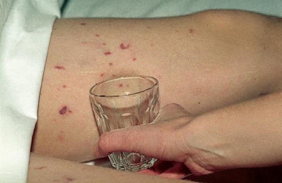 Mange som blir syke med meningokokkbakterien får et karakteristisk utslett fordi bakteriene gir blodforgiftning og forårsaker små bloduttredelser under huden. Bloduttredelsene ser ut som små, røde eller lilla prikker. De sitter ofte på ben eller armer, men kan sitte over hele kroppen. Trykk et vanlig, rent drikkeglass mot en av prikkene og se på den gjennom glasset. Hvis prikken fortsatt er godt synlig kan dette være et tegn på meningokokksykdom. Da skal du øyeblikkelig kontakte lege.