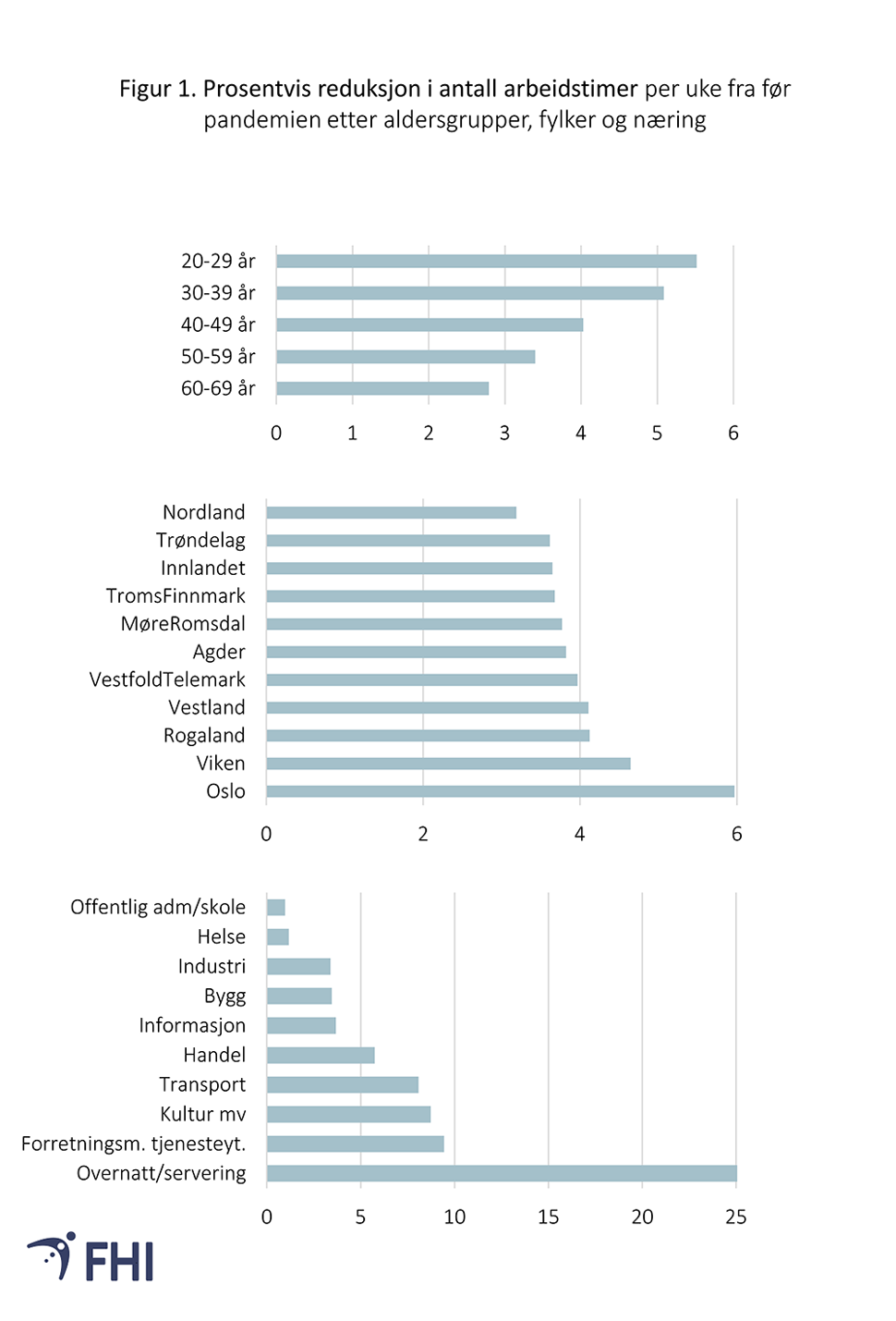 Figur 1 viser bortfall av arbeidstid grunnet permitteringer eller oppsigelser for ulike grupper av arbeidstakere i perioden mars til desember 2020. De yngre aldergruppene hadde større bortfall av arbeidstid per uke fra før pandemien enn de eldre (øverst). Arbeidstakere i Oslo hadde særlig stort fall på (-6%, i midten), og det var stor variasjon mellom ulike fylker. Av ulike næringsgrupper ble overnattings- og serveringsvirksomheter hardest rammet (-25%, nederst).