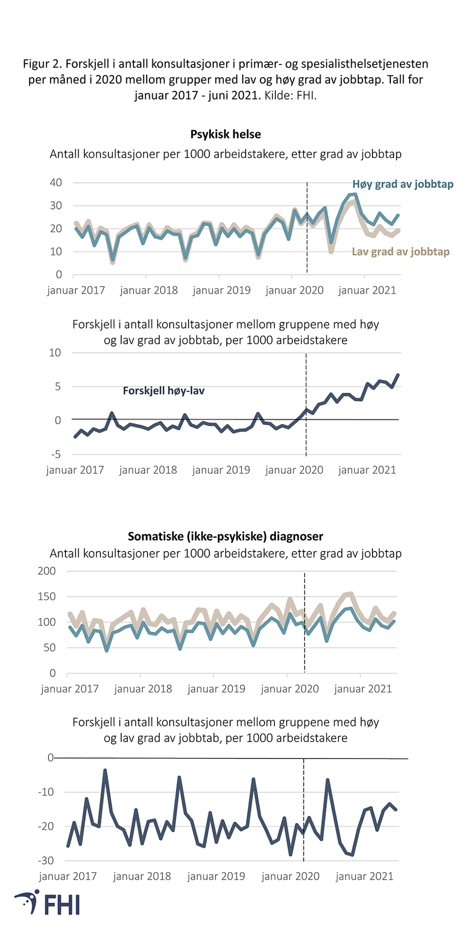 I analysene her ser vi at omfattende permitteringer og økning i arbeidsledighet under pandemien har forekommet samtidig med en markert økning i bruk av primær- og spesialisthelsetjenesten for psykiske diagnoser. Vi finner ingen klar økning i helsetjenestebruk for ikke-psykiske (somatiske) diagnoser. Vi tror økningen i bruk av helsetjenester reflekterer en endring i psykisk helse, ettersom vi ikke har grunn til å tro at pandemien har hatt ulik effekt på terskelen for å søke helsehjelp hos de ulike gruppene vi har undersøkt.