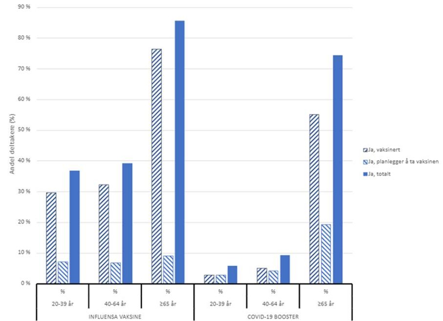 For influensavaksinen var hovedårsaker til vaksinasjon å unngå å bli syk, tilhøre en risikogruppe og å beskytte andre. En stor andel av friske voksne under 65 år tok også influensavaksinen, selv om de ikke var i målgruppen for vaksinasjonsanbefalingen. Det ser ut til at mange har benyttet seg av influensavaksinasjonstilbud på arbeidsplassen. Få var opptatt av pris for influensavaksinen, men andelen som var opptatt av pris var høyere blant unge voksne.