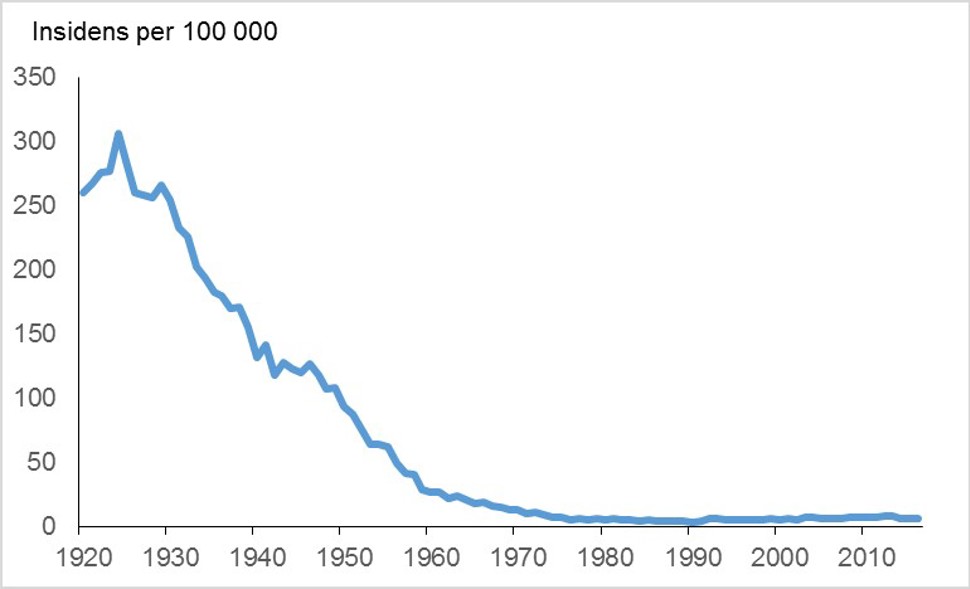 For hundre år siden var forekomsten av tuberkulose svært høy i Norge, men sykdommen gikk jevnt tilbake fram til slutten av 1940-årene. Kombinasjonen av effektive medikamenter, skjermbildeundersøkelser for tidlig diagnostikk, BCG-vaksinasjon og bedring i levestandard førte til ytterligere tilbakegang fram til 1970-tallet. Da ble imidlertid tilbakegangen langsommere (figur 3.1).