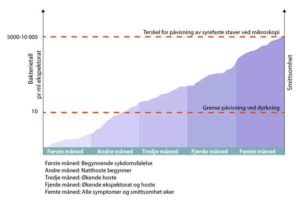 Figur 7.1 viser en skjematisk fremstilling av sykdomsutvikling over tid, og viser at symptomer, bakteriemengde og smittsomhet øker med tiden fra innsykning. Figuren illustrerer også når vi kan forvente at dyrkning og direkte mikroskopi kan vise positivt resultat. Hvor raskt utviklingen går fra «frisk» til «svært syk og smittsom» avhenger blant annet av bakteriens virulens, smittedose og individuelle forhold knyttet til pasientens immunforsvar. Tidslinjen og bakteriemengden i ekspektorat må leses som et eksempel, og ikke tolkes bokstavelig. Generelt vil sensitiviteten ved de ulike metodene for mikrobiologisk diagnostikk (PCR, dyrkning og mikroskopi) variere med kvalitet på utstyr, type biologisk materiale og erfaring hos utøver.
