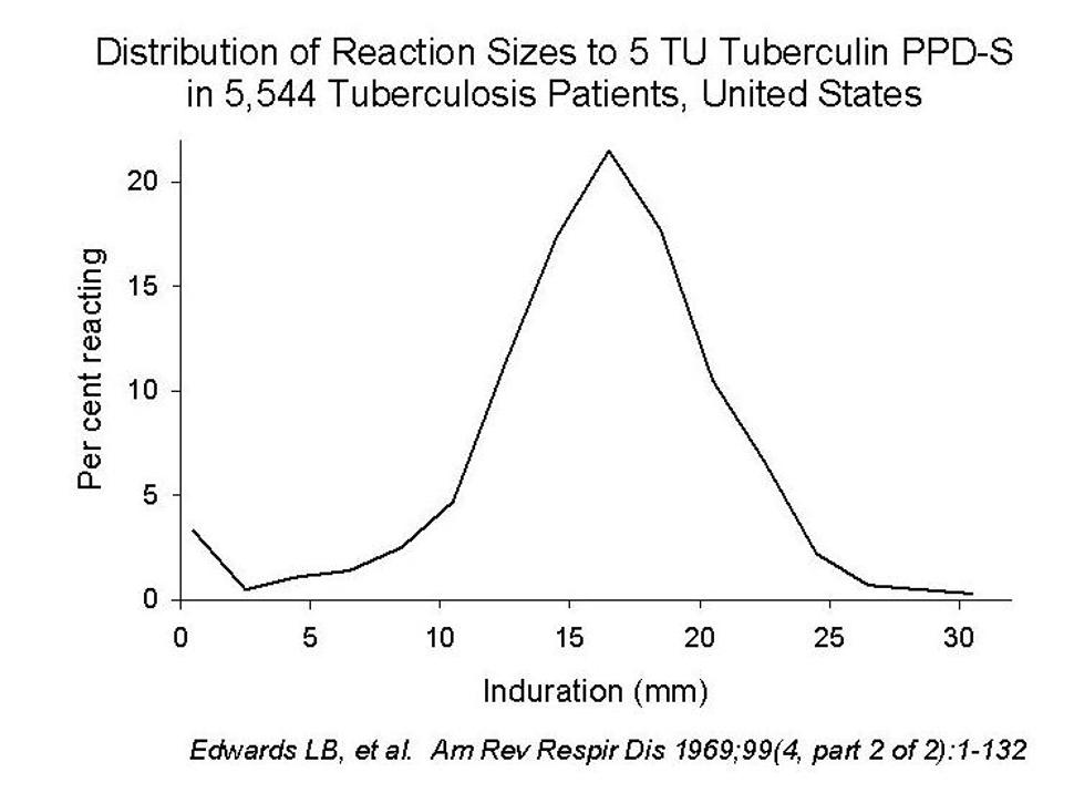 Studier av pasienter med dyrkningsbekreftet tuberkulosesykdom har vist at størrelsen på tuberkulinindurasjonen er normalfordelt med et topp-punkt rundt omkring 16-17 mm (5 TU tuberculin PPD-S). Få pasienter har reaksjoner under 10 mm, men det utgjør en viss andel (Edwards et.al., 1969) (figur 8.2 ). I Norge hadde 4,5% av menn og 7,1% av kvinner med tuberkulosesykdom i begynnelsen av 1950-tallet negativ Pirquet-prøve, 1,1% og 2,1% blant pasienter under 40-års alder, 2,0% og 4,2% i alderen 40-59 år og 13,0% og 18,4% i aldersgruppen >60 år (Statens skjermbildefotografering, 1952).