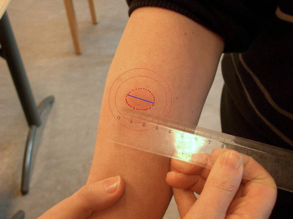 Avlesning skal skje etter 72 timer. Det avleses på tvers av underarmen. Kun indurasjonen avleses.