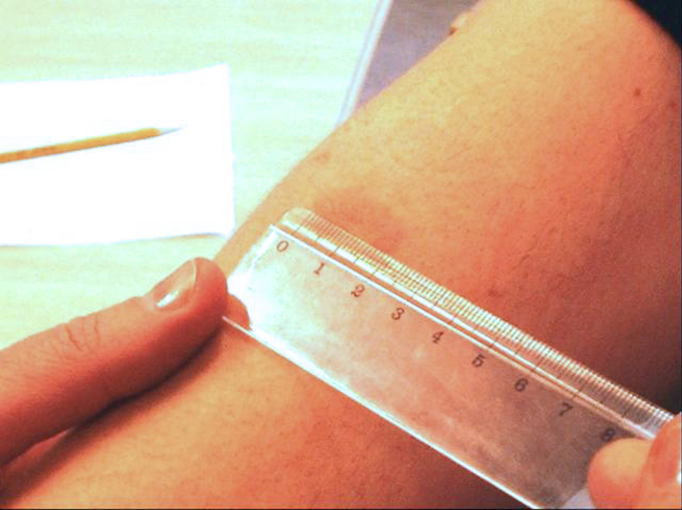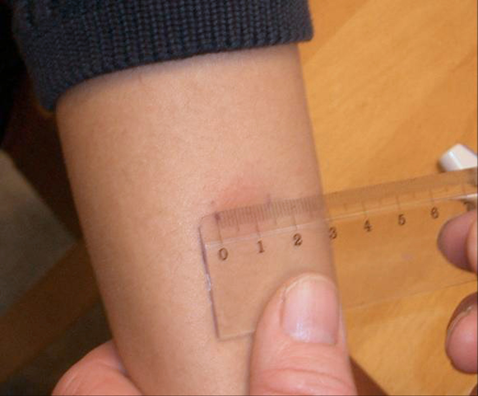 Her anes en stor ruborsone rundt en kraftig reaksjon med indurasjon på 22 mm. Armen skal ikke hvile mot underlaget.