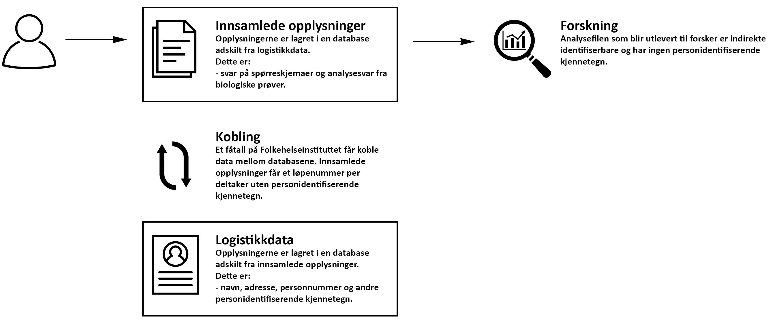 - I en adskilt database ligger svar på spørreskjema fra deg og analysesvar fra dine biologiske prøver (blodprøver og andre biologiske prøver). Vi kaller dette innsamlede opplysninger. Det er disse opplysningene forskere kan søke tilgang til.