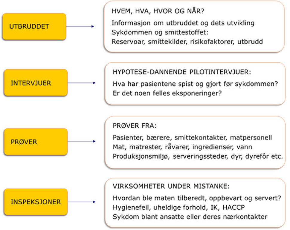 - Kvalifiserte hypoteser utarbeides ved å samle alle tilgjengelige opplysninger fra karakterisering av utbruddet (kapittel 8), samt fra intervjuer, prøvetaking og inspeksjoner.