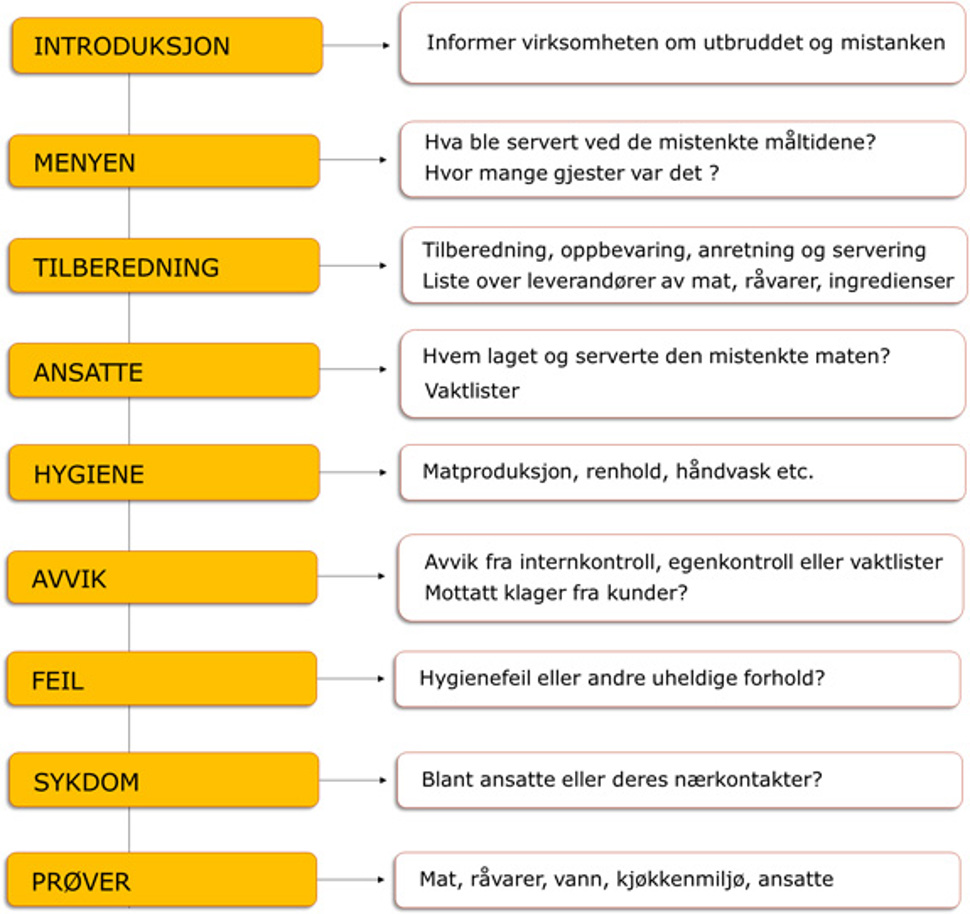 - Inspeksjon av virksomheter der mistenkte næringsmidler er produsert, tilberedt eller servert, blir utført for å avdekke eventuelle hygienefeil eller andre uheldige forhold som kan bidra til å identifisere årsaken til utbruddet.