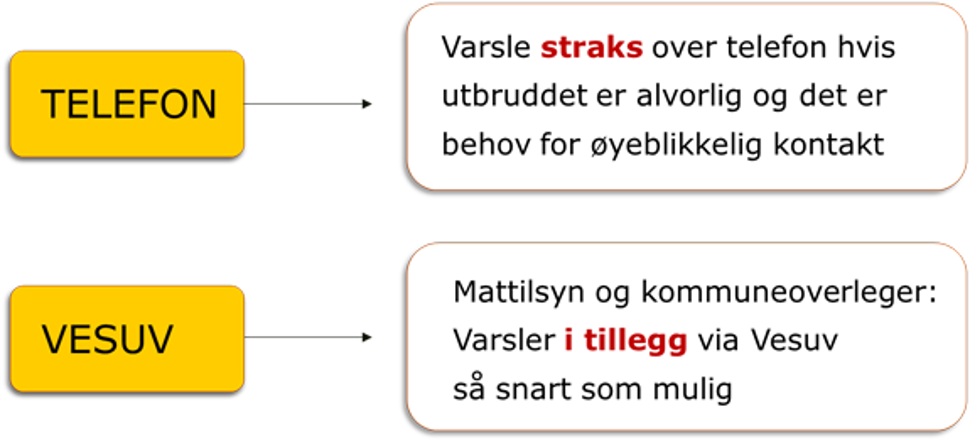 Dersom utbruddet er alvorlig, og det er behov for umiddelbar kontakt, skal det først varsles over telefon for å sikre at varslet raskt blir mottatt. Varsling gjennom Vesuv skal likevel utføres så snart som mulig (figur 5.2).