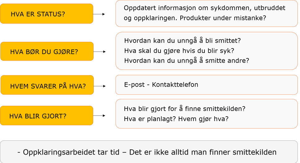 - Opplysninger om hva som blir gjort for å finne årsaken, og hva som er planlagt, hvilke tiltak som er iverksatt, og hvilke etater som har ansvaret for ulike ledd i oppklaringen. Det er viktig å formidle positiv informasjon om at noe blir gjort for å bringe situasjonen under kontroll.