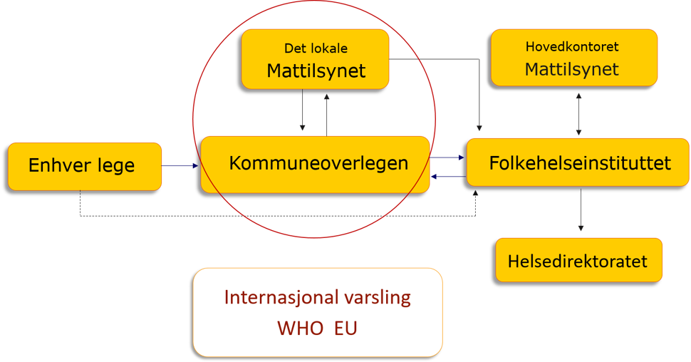 Den gjensidige varslingsplikten mellom Mattilsynets lokale avdeling og kommuneoverlegen er fremhevet med en sirkel. Stiplete linjer viser direkte varsling til Folkehelseinstituttet, noe regelverket åpner for dersom kommuneoverlegen ikke kan nås, men kommuneoverlegen skal likevel varsles ved første anledning.