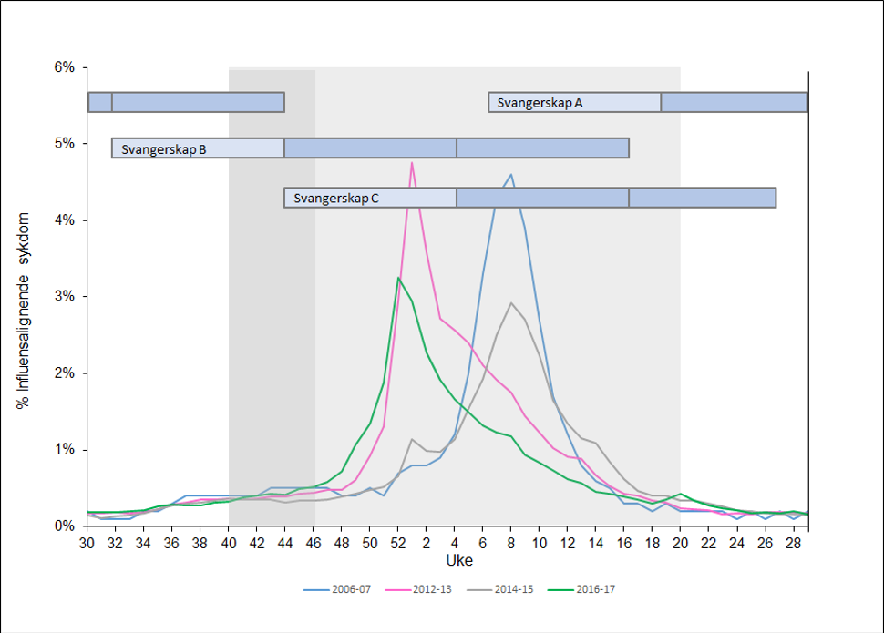 - Svangerskap C: Den gravide tilbys vaksine når hun kommer i 2. trimester (på nyåret), med mindre influensatoppen alt er passert og sirkulasjonen lokalt anses som meget begrenset.